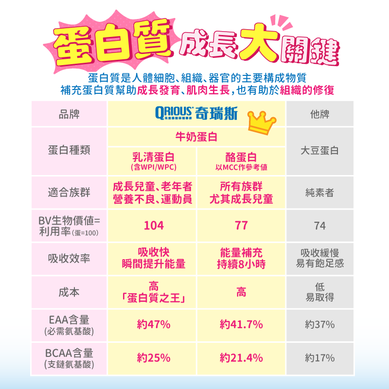 QRIOUS®奇瑞斯複方蛋白+鈣成長飲品由台灣製造,是市面上針對兒童需要推出的含鈣蛋白粉,補充兒童發育補鈣必備。