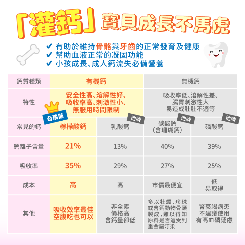 🔷 含高吸收『檸檬酸鈣』有機鈣維持骨骼牙齒正常發育,補充鈣質流失