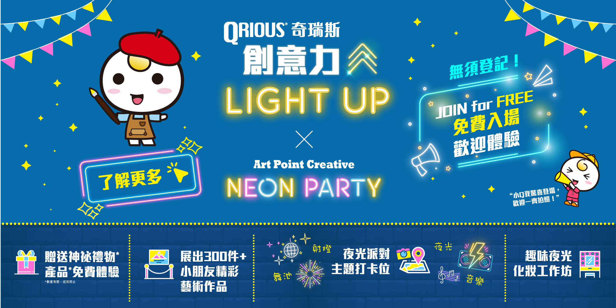 Qrious奇瑞斯 聯乘 Art Point Creative 青衣畫室/美孚畫室,讓觀眾體驗小朋友運用無限藝術創意力畫上有趣作品,在這夜光派主題下盡情放電打卡留念!